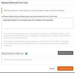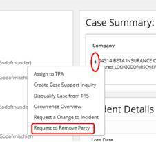 - Go to the Case Overview and click the vertical ellipsis to the left of your company. Select Request to Remove Party and enter the justification on why this company should be removed from the case, then click Submit Request (evidence can be added, if needed).