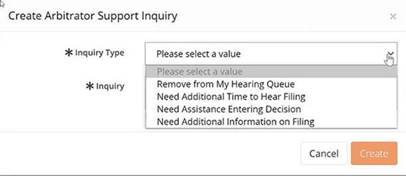 Arbitrators can also check the status of their inquiries from their worklist in the “My Support Inquiries” tab by selecting “View Inquiry.”