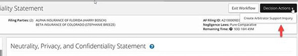 Need to submit an arbitrator support inquiry? In TRS, arbitrators can request assistance by using Decision Actions in the top-right corner of the decision workflow.